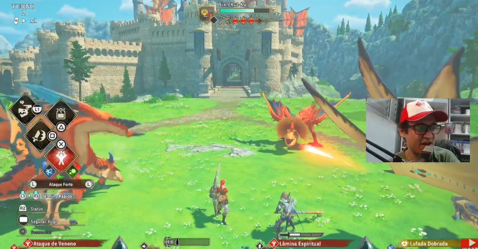 Depois do seu personagem, tem seu parceiro que ataca sozinho e o turno dos monstros, então isso me deu uma sensação de não estar controlando muito a luta, eu gostaria de escolher a ação do meu parceiro, acho que seria melhor, se tivesse 3 humanos talvez eu gostasse mais, porem imagino que 3 humanos e 3 monstros ficaria complicado de mostrar na tela.